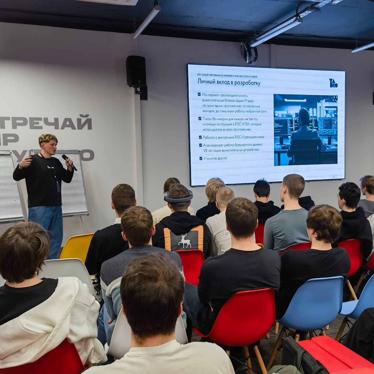 Участникам рассказали о стажировках и программах для студентов и начинающих разработчиков, о том, как выстраивается путь от студента до инженера в крупной ИТ-компании, а также о задачах, над которыми сегодня работают команды YADRO. Отдельно обсудили образовательные проекты, которые помогают быстрее войти в профессию.